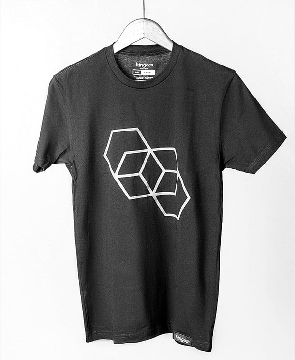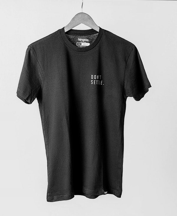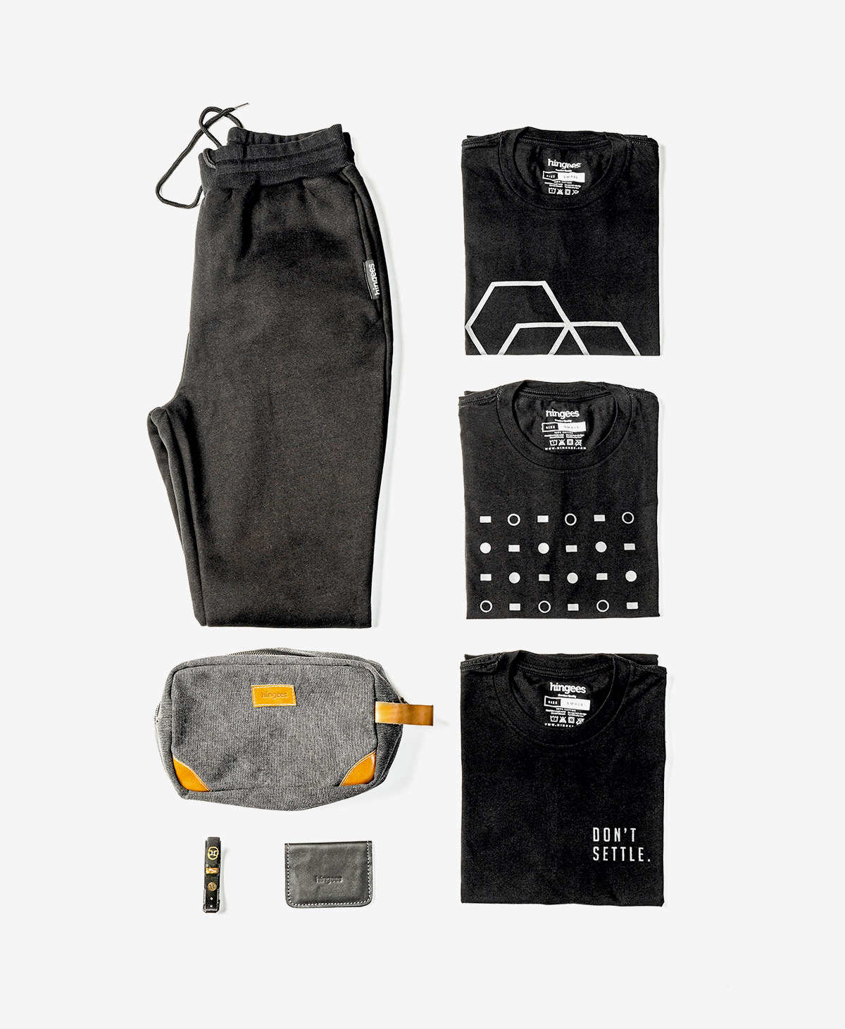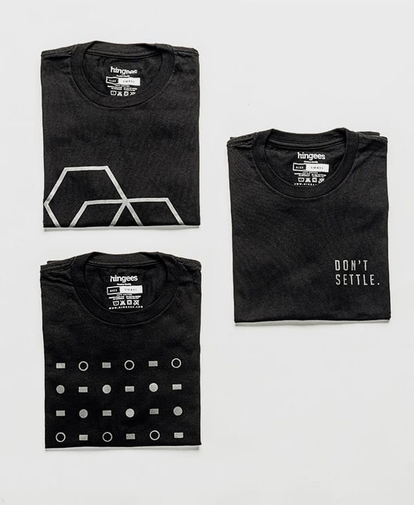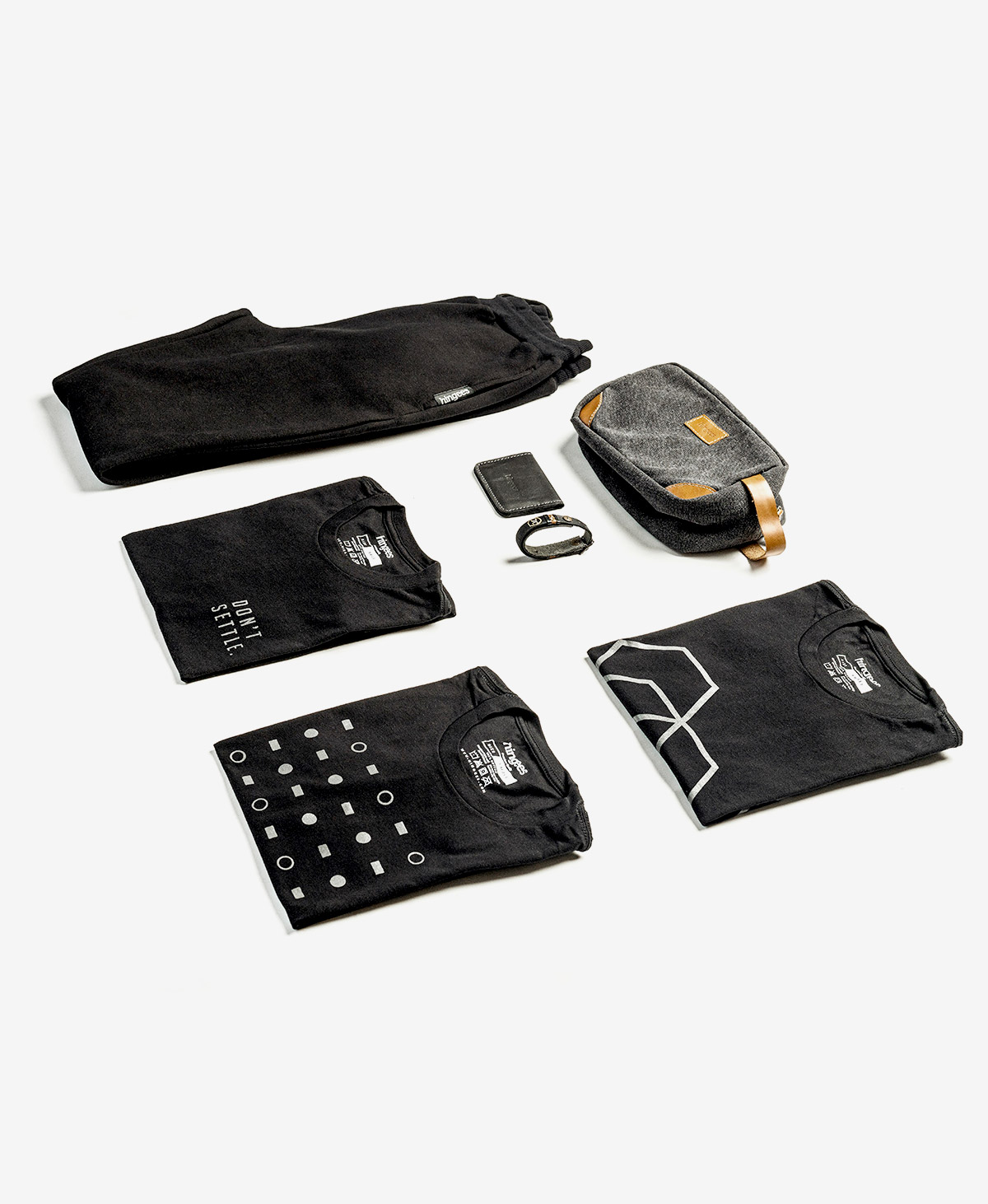 Grab the complete Black Series (all 7 items – 3 t-shirts, Sweatpants, Dopp kit, Cardholder, Bracelet ) and save. Three of our best-selling t-shirts from 2022 in sleek new black versions – Don’t Settle, Polygonal, and Binary. New soft and cozy sweatpants in black, dark grey Dopp kit, black sweatpants, black card holder, and a black threaded Hingees bracelet.