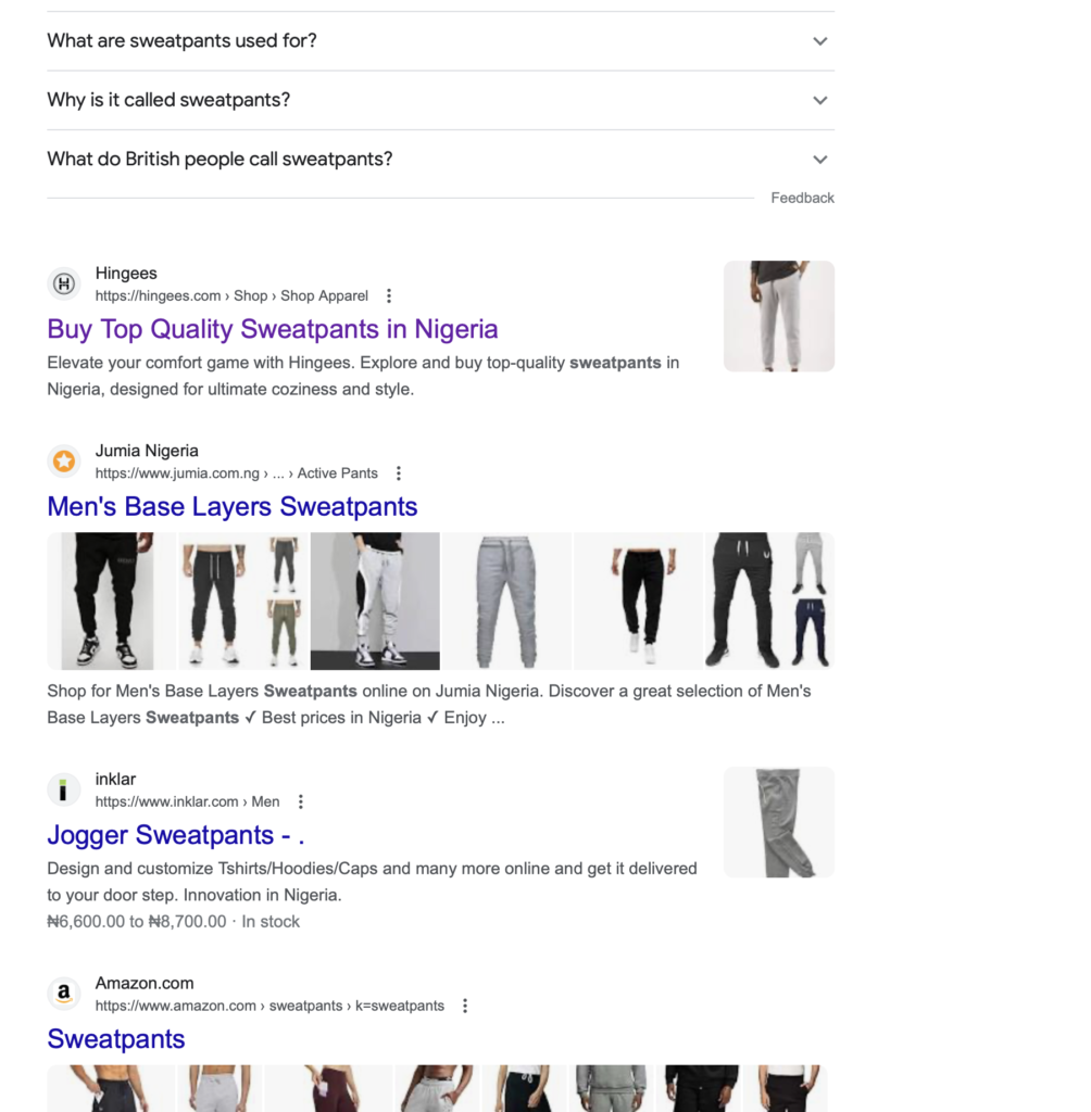 If you search for “sweatpants” from a Nigerian IP address, Hingees now appears as the second result, right after Jumia and even ahead of Amazon. This achievement is absolutely massive for us, and we owe it all to Afeez’s SEO expertise.