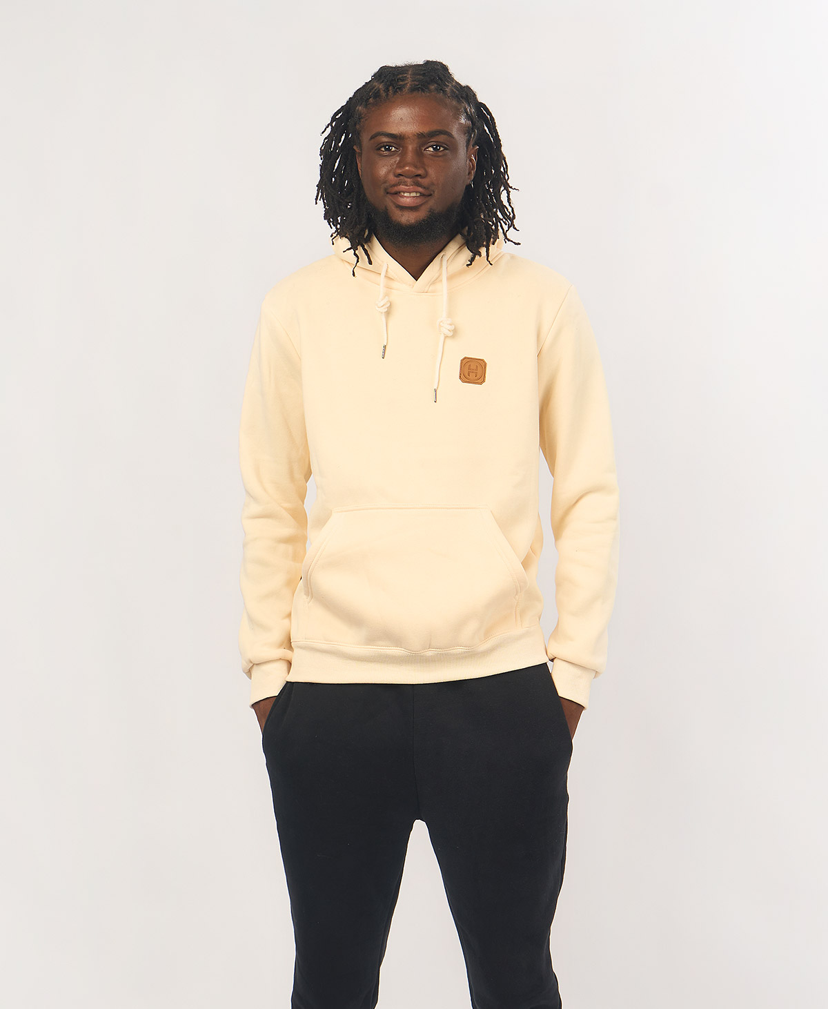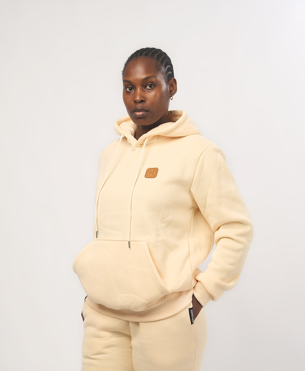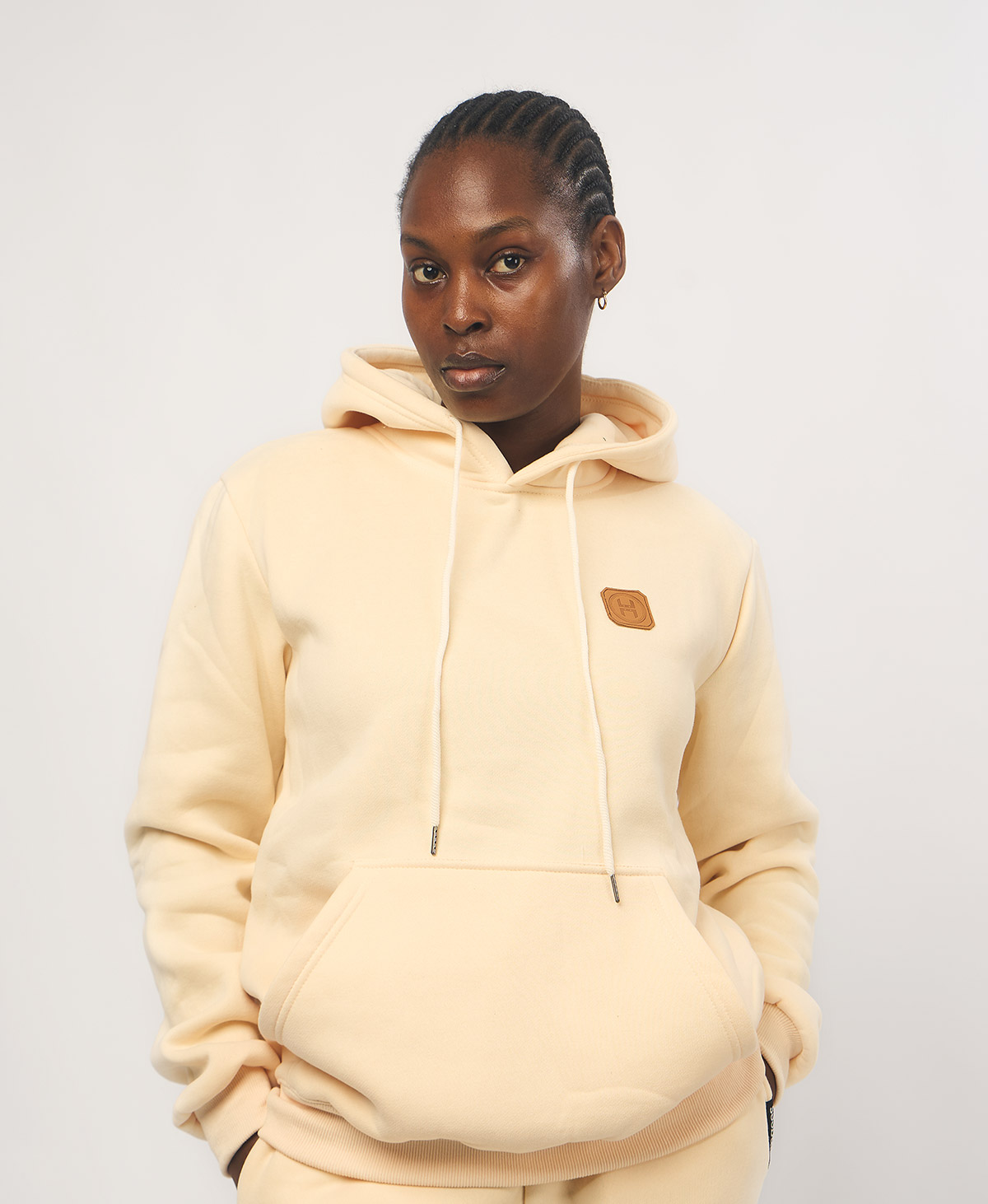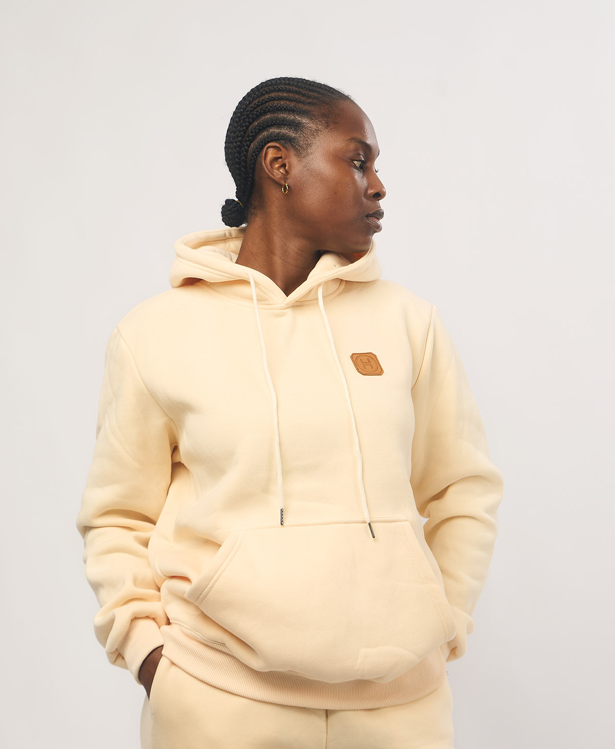 Be the first to review “Leather Patch Hoodie — Beige”